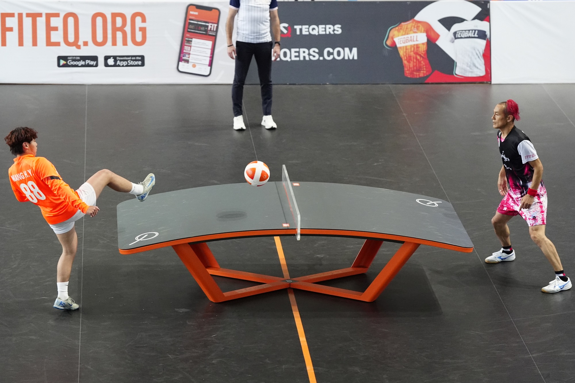 TETSUHARU SUZUKI (JPN) and Guangxing LIU (CHN) in action during in the Men’s Single match of the TEQBALL Championships 2025 Jinan on April 19, 2025 in Jinan, China. (Photo by Larry FEI/ TEQBALL) Larry FEI / TEQBALL